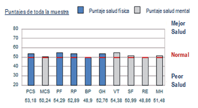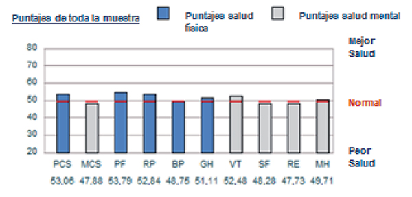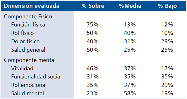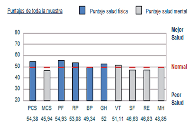 Al analizar el total de la muestra para cada dimensión de calidad de vida no se encontraron valores bajo la normalidad (Figura 2). Las otras dimensiones de calidad de vida se muestran en la Tabla 4.