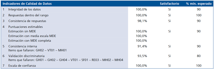 Se aplicaron diversos indicadores para medir la calidad de datos, evaluando la consistencia y confiabilidad de estos. Dentro de los indicadores aplicados se incluyó: evaluación de datos perdidos, respuestas dentro del rango, consistencia de las respuestas, puntuaciones estimables, consistencia interna, validación discriminatoria y escalas de confianza, los cuales se encuentran estandarizados y definidos para la aplicación de la encuesta realizada. Todas las variables analizadas para la evaluación de la calidad de los datos se encuentran dentro del rango satisfactorio. Los resultados se encuentran representados en la Tabla 211.