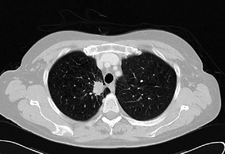 Figura 2. TAC torácico que demuestra nódulo pulmonar espiculado en segmento apical del lóbulo superior derecho con retracción pleural mediastínica adyacente de aspecto neoplásico; correspondiente con el tumor primario.La paciente no presenta signos de deshidratación y mantiene una tensión arterial en torno a 120/85 mmHg. En la analítica basal no se observan alteraciones destacables: glucosa 85 mg/dl (74-106 mg/dl), creatinina 0,61 mg/dl (0,51-0,95 mg/dl), urea 18 mg/dl (17-43 mg/dl), sodio 143 mEq/L (136-146 mEq/L), potasio 4 mEq/L (3,5-5 mEq/L) y calcio 9,1 mg/dl (8,5-10 mg/dl).
