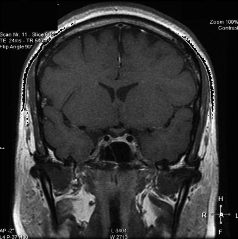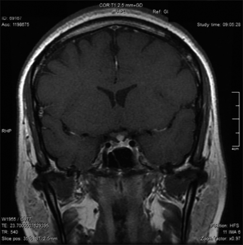 Posteriormente, consultó con especialista endocrinólogo donde se le solicitó exámenes que destacaba: glicemia 97 mg/dl, creatininemia 0,71 mg/dl, sodio 145 mEq/l, potasio 3,6 mEq/l, cloro 105 mEq/l, FSH 3,8 MUI/ml, Estradiol 12 pg/ml, prolactina 20,6 ng/ml, TSH 4,69 UI/ml, T4 libre 1,0 ng/dl, IGF-1 30,8 ng/ml (130-354), cortisol 151 ng/ml (40-230). Resonancia magnética (RM) de la región selar informó “silla turca normal, engrosamiento nodular del tercio medio distal del tallo hipofisiario y no se identifica señal de la neurohipófisis” (Figura 1). Se ajustó DDAVP a 2 puff en la mañana y 1 puff en la tarde, logrando ya normalizar la diuresis diurna y no tener nicturia. Se solicitó control RM en forma precoz para evaluar evolución de engrosamiento del tallo y segunda resonancia informó “no se identifica señal de neurohipófisis, evolución regresiva del engrosamiento del tallo hipofisiario respecto a RM previa” (Figura 2). Se establece diagnóstico de Infundibuloneurohipofisitis, Diabetes Insípida central y amenorrea secundaria por hipogonadismo hipogonadotrópico. La paciente evoluciona en forma adecuada, asintomática, con completo control de la diuresis, y dado el compromiso gonadal y la edad se inició terapia reemplazo hormonal. Siguiente RM evidenció normalización del grosor del tallo hipofisiario, sin evidenciar la neurohipófisis.
