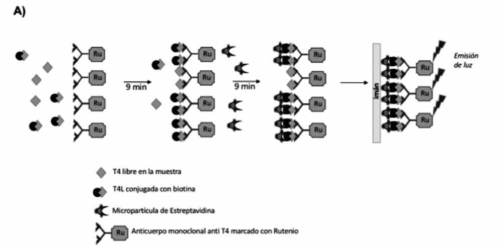 Las determinaciones de T3 y T4 libre se basan en el mismo principio en el ensayo ECLIA de COBAS 8000/Roche Diagnostics®. Por esta razón, elegimos la determinación de T4 libre como ejemplo, para analizar la discrepancia de valores entregadas por dos equipos diferentes. En este ensayo, participan los siguientes elementos: T4 libre del suero, T4 conjugada con biotina, estreptavidina unida a partículas magnéticas y un anticuerpo especifico anti-T4 marcado con Rutenio (Ru). Este es un inmunoensayo competitivo en donde la T4 del suero del paciente y la T4 conjugada con biotina compiten por los sitios de unión de un anticuerpo específico anti T4 que se encuentra en cantidad limitada y que está marcado con Ru. Cumplido el tiempo de incubación, la T4 libre de la muestra y la T4 conjugada con biotina se unen al anticuerpo marcado con Ru. Luego, se agregan las micropartículas recubiertas de estreptavidina que se unirán a la biotina-T4. Posteriormente, el complejo T4 unido al anticuerpo marcado con Ru y el complejo estreptavidinabiotina- T4 unido al anticuerpo marcado con Ru se acerca a una fase sólida que tiene un imán. En este sistema solo puede fijarse al imán el complejo anticuerpo marcado con Ru unido a T4-biotina-estreptavidina por las partículas magnéticas que tiene esta última. Los elementos no fijados se eliminan por lavado. Al aplicar una corriente eléctrica definida, el Ru genera una reacción quimioluminiscente cuya emisión de luz se mide en un fotomultiplicador. Finalmente, la cantidad de T4 libre será inversamente proporcional a la cantidad de luz registrada, ya que, si el suero contiene poca T4 libre, la cantidad de T4-biotina unida al anticuerpo será alta lo que deriva en mayor formación del complejo estreptavidina biotina ligado al anticuerpo marcado con Rutenio y, por ende, en una mayor producción de luz y viceversa (Figura 1, panel superior A).