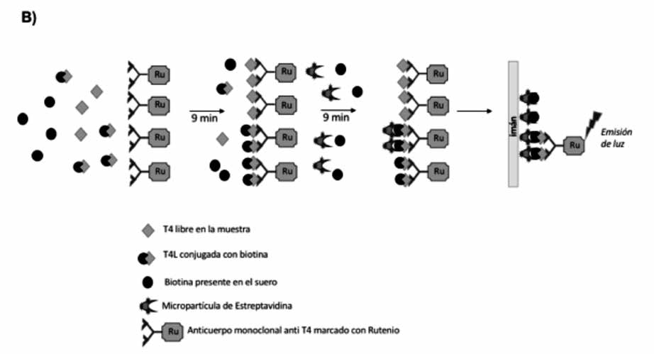 Figura 1. Esquemas que representan dos inmunoensayos para medir T4 libre en dos equipos automatizados diferentes. Comparación entre ensayo ECLIA de COBAS 8000/Roche Diagnosticsâ en ausencia de biotina (A) y en presencia de biotina (B).