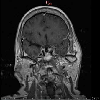 Figura 1b. RMN de silla turca contrastada con gadolinio. Corte coronal en T1. Cortes 2.5 mm.Rx de tórax: diámetro transverso del corazón aumentado. Teniendo en cuenta el cuadro clínico, los estudios hormonales y radiológicos, se realizó el diagnóstico de acromegalia. Se indicó el tratamiento farmacológico con octreotide 20 mg 1 bulbo mensual, logrando mejoría de la sintomatología dolorosa, control de DM2 e hipertensión arterial y, en los exámenes de laboratorio un valor de IGF-1 igual a 173 ng/ml (69 - 200 ng/mL).