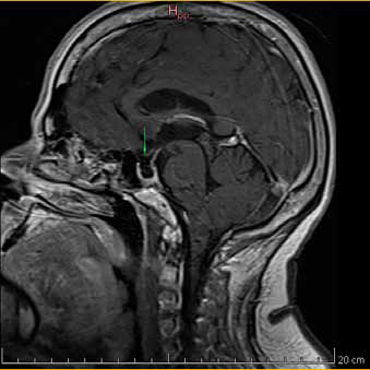 Figura 1a. RMN de silla turca contrastada con gadolinio. Corte sagital en T1. Cortes 2.5 mm. Se señala región selar.