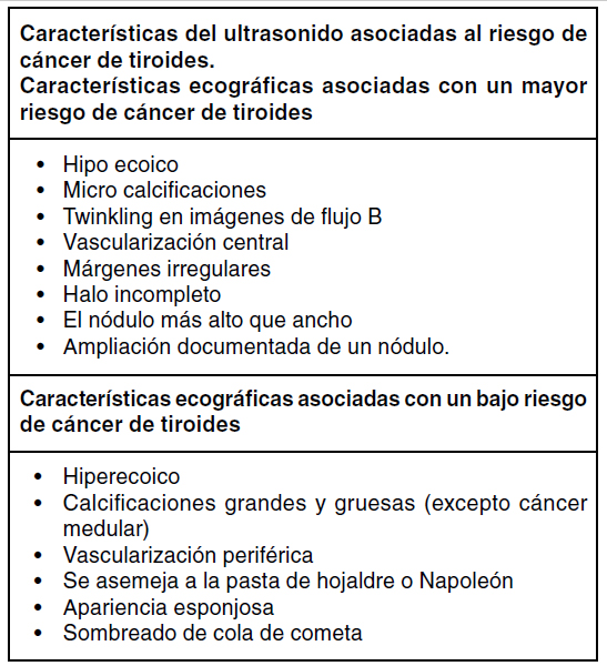 Hay varios hallazgos ecográficos que son sospechosos de cáncer de tiroides (Tabla 1). La clínica de imagen de nuestro hospital utiliza el sistema de categorización ecográfico de nódulos tiroideos TI-RADS que fue propuesto por Horvath y cols en el año 2009 con el objetivo de poder diferenciar todo tipo de nódulos tiroideos en: benignos y malignos y así poder definir cuáles de éstos son electivos para biopsia o punción por aspiración de aguja fina, basado en la presencia de calcificaciones, vascularización, ecogenicidad y estructura del nódulo.