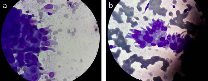 Mujer de 49 años, sin antecedentes patológicos a destacar y sin antecedentes de radiación de cabeza y cuello, o antecedentes familiares de enfermedad tiroidea. Tres meses previos notó crecimiento rápido de tumoración cervical con dolor; además disfonía del mismo tiempo de evolución. Al examen se palpó nódulo en lóbulo tiroideo derecho, de 4 cm, firme, que causaba una posición antálgica con lateralización del cuello hacia izquierda. La ecografía de cuello mostró glándula tiroides aumentada a expensas del lóbulo derecho (LD), que presentó nódulo predominantemente sólido, de 34x29 mm, heterogéneo, con sectores marcadamente hipoecogénicos y microcalcificaciones. No se evidenció claro plano graso de separación del nódulo con músculos infrahioideos a derecha, pero si del paquete vascular. No adenomegalias cervicales. TIRADS 5. Presentó eufunción tiroidea y valoración general normal. Se realizó punción citológica con aguja fina (PAAF) del nódulo que informó: Bethesda VI (Figura 1).