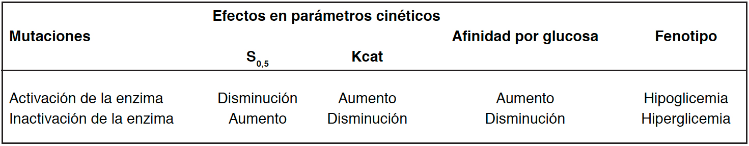Se describen las posibles alteraciones a nivel de parámetros cinéticos y de fenotipo, según si las mutaciones de la glucoquinasa provocan una activación o inactivación en su actividad enzimática. Se indican los efectos sobre la constante catalítica (Kcat), parámetro indicativo de la velocidad de reacción, y sobre el punto medio de respuesta cinética (S0,5), el que da cuenta del nivel de saturación de la enzima. Las diferentes mutaciones pueden modificar ambos o solo uno de estos parámetros cinéticos. Debido a que afectan la actividad y/o afinidad de la enzima por la glucosa, derivan usualmente en un fenotipo determinado, tal como se detalla en la tabla.