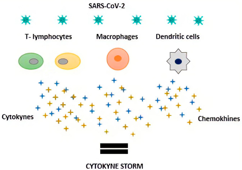 Las células inmunes del tejido adiposo tienen capacidad de secretar factores relacionados con la inflamación, lo que es determinante en el paso de un perfil antiinflamatorio a inflamatorio22, como es el caso de la desregulación y mayor liberación de interleucina 6 (IL-6). El tejido adiposo al presentar altos niveles de esta citocina y su receptor, IL-6R, propicia la activación de la misma y de la cascada de señalización de la infección viral, convirtiéndose en un reservorio importante para diversas entidades infecciosas, entre ellas SARSCoV- 223. A partir de esto, se puede relacionar el aumento de riesgo de padecer COVID-19 grave en pacientes obesos desencadenando la llamada “tormenta de citocinas”, que se entiende como una desenfrenada respuesta inmune generalizada con participación de linfocitos T, macrófagos y células dendríticas, las cuales provocan una sostenida secreción de citocinas y quimiocinas24,25 (Figura 3). Ante esta situación, un reciente estudio de la Cleveland Clinic, plantea el efecto protector de la cirugía metabólica en pacientes obesos infectados por SARS-CoV-2, postulando que los pacientes sometidos a cirugía previa a padecer COVID-19, presentan menores tasas de hospitalización y un mejor pronóstico al contraer la enfermedad. La baja de peso y la disminución del estado proinflamatorio sería la causa de este mejor pronóstico en estos pacientes26.