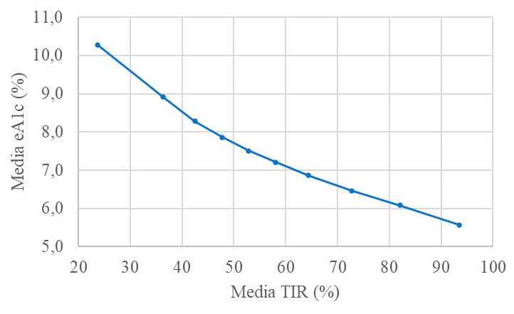 Las lecturas se dividieron en 10 grupos (deciles) del mismo tamaño (cada decil contenía aproximadamente 498 lectores en función del tiempo en rango). Para cada decil se calculó la media de determinaciones diarias, el promedio de glucosa, la HbA1c media estimada (promedio de glucosa mediante la fórmula propuesta por Nathan, que es aceptado por las sociedades internacionales de diabetes)15, la desviación estándar media de glucosa, el coeficiente de variación medio de la glucosa (desviación estándar/glucosa promedio), el tiempo medio en rango (porcentaje medio de tiempo entre 70 y 180 mg/dL), el tiempo medio de glucosa por encima de 250 mg/dL (TA250), el tiempo medio de glucosa por encima de 180 mg/dL (TA180), la mediana de tiempo por debajo de 70 mg/dL (TB70) y la mediana de tiempo por debajo de 54 mg/dL (TB54).