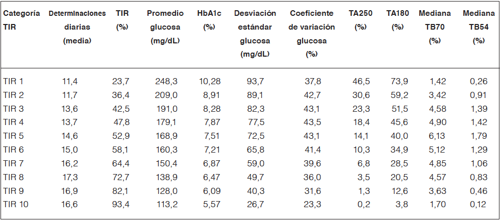 Tabla 1. Grupos deciles del tiempo en rango y las medias en el número de determinaciones diarias, glucosa promedio, HbA1c estimada, desviación estándar de glucosa, coeficiente de variación de glucosa, tiempo por encima de 250 mg/dL (TA 250), tiempo por encima de 180 mg/dL (TA180), y tiempo en rango 70-180 mg/dL, y mediana de tiempo por debajo de 70 mg/dL (TB70) y tiempo por debajo de 54 mg/dL (TB54).