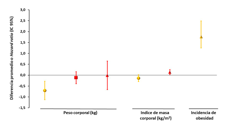 La OMS basó su recomendación en el análisis de estudios orientados a controlar el peso corporal mediante el uso de ENA en adultos y niños/as. El control de peso referido a su pérdida en caso de sobrepeso u obesidad, o la prevención de su ganancia en individuos con peso saludable. La figura 1 resume los hallazgos sobre el peso corporal, índice de masa corporal (IMC) e incidencia de obesidad a partir de estudios de intervención u observacionales en adultos. Para peso corporal, los estudios de intervención aleatorios y controlados (n=29; 2.433 adultos) mostraron una diferencia promedio de peso a favor del consumo de ENA de -0,71 kg (IC95% -1,13 - -0,28). Dado su heterogeneidad, se analizaron los estudios según el tipo de diseño experimental. De especial relevancia son aquellos que reemplazaron alimentos (sólidos o líquidos) con azúcares libres por sus homólogos con ENA. La comparación entre grupos mostró una diferencia promedio de peso que no alcanzó significancia estadística (-0,61 kg; IC95% -1,28 - 0,06; n=4; 597 adultos). Para el IMC, los estudios de intervención (n=23; 1.857 adultos) no mostraron diferencias entre grupos (diferencia promedio: -0,14 kg/m2; IC95% -0,30 - 0,02). También se analizaron marcadores de adiposidad, que incluyeron circunferencia de cintura, razón cintura/cadera y masa grasa (absoluta y relativa). Ninguno de estos marcadores difirió entre el grupo intervenido con ENA y el grupo control. En población infantil los resultados de los estudios de intervención son similares a los estudios en adultos.
