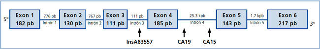 Se han descrito en la literatura distintos polimorfismos del gen HSD11B1. Los más relevantes resultan ser: una inserción de A en el intrón 3 (InsA83557) y dos microsatélites dinucleotídicos (CA15 y CA19) ubicados en el intrón 4. Estas repeticiones se denominan así por presentar 15 y 19 repeticiones de CA en su secuencia, respectivamente (Figura 1). Su relevancia radica en que podrían alterar la expresión génica del gen HSD11B1. Estudios en este campo se han destinado a elucidar un posible rol de estas secuencias repetitivas en la contribución genética en enfermedades complejas, como síndrome metabólico y obesidad central8,12.