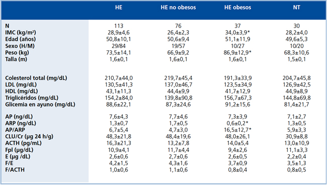 Tabla 1. Parámetros clínicos y bioquímicos de pacientes hipertensos esenciales (HE) y sujetos normotensos (NT*).