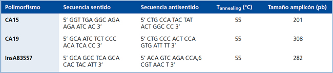 Las reacciones de PCR se realizaron en un termociclador Mastercicler® Eppendorf usando aproximadamente 0,1 a 0,5 μg de ADN, 5 pmoles del partidor sentido, 5 pmoles de partidor antisentido, cuyas características se encuentran en la Tabla 2, 1,25 pmoles de cada dNTP y 1 U de ADN Taq polimerasa en Tris HCl 75 mM (pH 9), KCl 50mM, (NH4)2 SO4 20 mM y MgCl2 2 mM en un volumen final de 25 μL. Las secuencias y propiedades de los partidores se encuentran en la Tabla 3. El programa térmico que se usó para la PCR constó de las siguientes etapas: 1) una desnaturación inicial a 94°C durante 2 min; 2) 30 ciclos de amplificación con una desnaturación a 94°C durante 30 s, un apareamiento a 55°C, tanto para InsA83557 como para los microsatélites CA15 y CA19, durante 30 s y una polimerización a 72°C durante 30 s; y 3) una polimerización final durante 10 min a 72°C. El RFLP se realizó con el mismo termociclador, utilizando 10 μL del producto del PCR, equivalentes aproximadamente a 10 μg, 0,13 U de XcmI en 50 mM NaCl, 10 mM Tris-HCl (pH9), 10 mM MgCl2 y 1 mM DTT en un volumen final de 25 μL. El programa térmico para la digestión enzimática fue el siguiente: digestión enzimática por 2 h a 37°C y una inactivación por calor durante 20 min a 65°C.