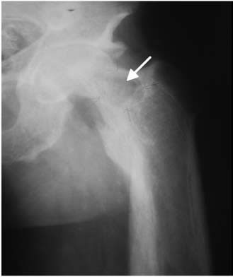 Hombre de 37 años de edad, con insuficiencia renal crónica por enfermedad de Berger, en hemodiálisis trisemanal desde los 20 años de edad. A los 21 años se efectúa trasplante renal de donante vivo. Reingresó a hemodiálisis por rechazo del injerto a los 24 años de edad. Evolucionó con HPT 2° progresivo (PTH: 4414 pg/mL), por lo que en otro centro asistencial se efectuó, a los 29 años, paratiroidectomía de las dos glándulas superiores. A pesar de esto, el HPT 2° no se modificó, presentando a los 34 años de edad fractura no traumática de fémur izquierdo. En mayo de 2008, es visto en nuestro servicio con intenso dolor en la cadera izquierda; el estudio radiológico evidenció un gran tumor pardo en el cuello femoral izquierdo de 5 cm de diámetro (Figura 1). La concentración de PTH era 4658 pg/mL.