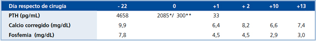 Para certificar intraoperatoriamente el carácter total de la extirpación quirúrgica es necesario medir PTH, que a los 20 minutos de concluida debería haber bajado no menos de 80% de su valor basal. En nuestro paciente esta baja fue de 85%.