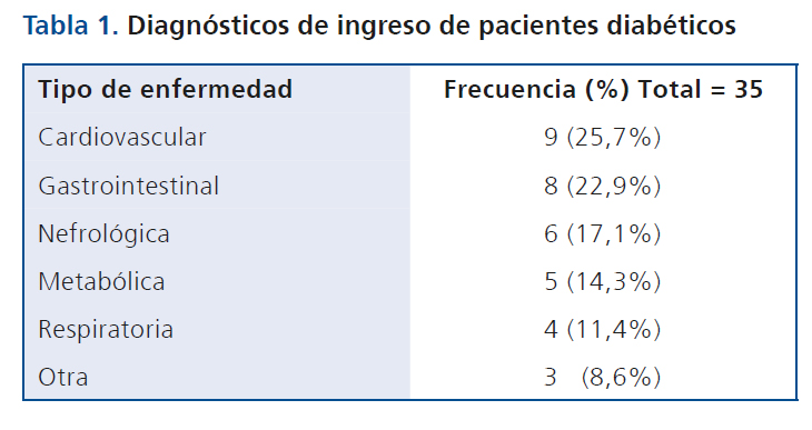 En el período analizado, hubo 266 egresos del Servicio de Medicina, de los cuales 43 fueron pacientes diabéticos, y 8 de ellos fueron excluidos por no contar con datos completos, resultando un n = 35. Todos fueron diabéticos tipo 2 (DM tipo 2). La prevalencia de los pacientes diabéticos en este período comprendió el 13,15% (n = 35/266) de los cuales un 97,1% (n = 34) fueron mayores de 40 años y un 54,3% (n = 19) mujeres.