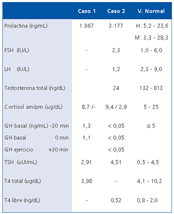 Nina de 15 anos de edad sin antecedentes morbidos. Tuvo su menarquia a los 14 anos, sin menstruaciones posteriores. Desde septiembre del 2008 nota disminucion progresiva de la agudeza visual, asociada a cefalea y galactorrea de 2 anos de evolucion. En marzo de 2009 se realiza campimetria que demuestra hemianopsia bitemporal y el oftalmologo detecta defecto pupilar aferente. La RM mostro un proceso expansivo selar y supraselar solido y quistico de 3 x 3 x 1,9 cm con extension hacia el seno cavernoso izquierdo, con desplazamiento y compresion del quiasma optico especialmente a derecha (Figura 1A). Al examen fisico destacaba hemianopsia bitemporal detectada por confrontacion. Eutrofica con ausencia de caracteres sexuales secundarios, incluido el vello axilar y pubiano (Tanner I). El desarrollo mamario era escaso (Tanner II) y no habia galactorrea. El estudio hormonal pre-operatorio mostraba prolactinemia muy elevada (1967 ng/mL) y calcemia 9,0 mg/dL (VN: 8,1-10,2 mg/dL) (Tabla 1). Se realiza cirugia descompresiva por via transcraneana con reseccion parcial del macroadenoma. La biopsia y el estudio inmunohistoquimico describen la lesion como prolactinoma que, de acuerdo al indice de proliferacion celular, se catalogo como adenoma hipofisiario anaplasico (Prl positiva en 95% de celulas, HGH, ACTH, TSH, FSH, LH negativos, Ki-67 positivo en 8 a 10% de los nucleos). Cursa el postoperatorio sin complicaciones y con recuperacion visual bilateral parcial. Es dada de alta con indicacion de cortisol 20 mg/d, levotiroxina 50 ug/d y cabergolina 0,5 mg 2 veces/semana.