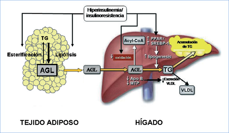 El sello distintivo de HGNA es la acumulación de triglicéridos (TG) en los hepatocitos. La patogenia exacta de este fenómeno es compleja y multifactorial y no se conoce con precisión21. Los mecanismos por los cuales se produce un depósito excesivo de grasa en el hígado no están completamente comprendidos, en parte por las limitaciones metodológicas y éticas para realizar estudios de causalidad en humanos. El conocimiento actual deriva de estudios en modelos animales de validez limitada y de observaciones clínicas con limitaciones metodológicas. Sin embargo, es ampliamente aceptado que la IR tiene un papel central en el desarrollo y la progresión de la enfermedad. Los pacientes con HGNA exhiben IR a nivel de músculo, tejido adiposo y del hígado22. En condiciones normales, la insulina suprime la producción hepática de glucosa, la que se ve alterada en paciente con HGNA, revelando la presencia de IR a nivel hepático. Además, estos pacientes muestran una reducción de hasta un 50% en la utilización de glucosa y presentan un defecto en la supresión de la lipólisis mediada tanpor insulina, lo que revela IR periferica y en el adipocito, respectivamente21,23,24. La evidencia disponible no permite discriminar cual es el principal lugar de IR en el HGNA, pero la recurrencia de la enfermedad despues del trasplante sugiere que la IR periferica es un hecho primario25. La IR periferica determina la ocurrencia de lipolisis no regulada a nivel del tejido adiposo, particularmente en el tejido adiposo visceral que a su vez resulta en un aumento del influjo de acidos grasos (AG) hacia el higado. Por otra parte, la IR se asocia a hiperinsulinemia compensadora que aumenta la lipogenesis hepatica de novo26. Estos dos factores son fundamentales en la genesis de la acumulacion hepatica de TG (Figura 2). Otras rutas como una insuficiente oxidacion hepatica de AG y/o alteracion de la sintesis o secrecion de lipoproteinas de muy baja densidad (VLDL) parecen tener menos importancia21.
