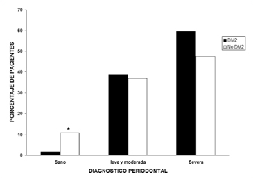 Figura 1. Distribución de los sujetos diabéticos y no diabéticos divididos según el diagnóstico periodontal en: sanos, periodontitis leve y moderada y periodontitis severa. El porcentaje de sujetos sanos es significativamente mayor en los no diabéticos (*p = 0,02). No se observó diferencia significativa entre ambos grupos para el porcentaje de sujetos con periodontitis leve y moderada (p = 0,08) o severa (p = 0,05). Discusión
