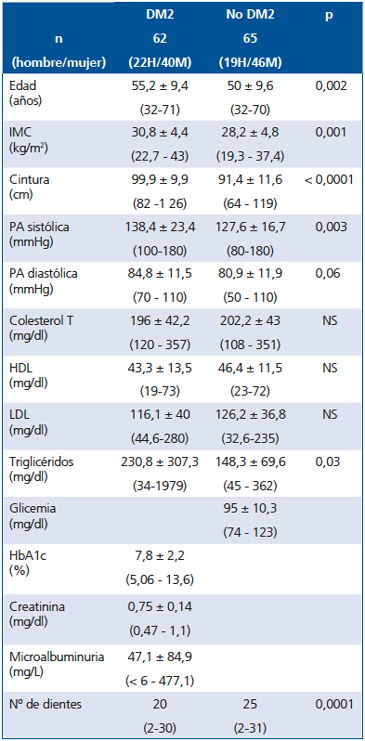 La muestra final estuvo constituida por 62 DM2 de 32 a 71 años de edad y 65 ND sin intolerancia a glucosa, en el mismo rango de edad, de diferentes áreas de Santiago y de nivel socio-económico medio bajo, medio y medio alto. La proporción entre hombres y mujeres fue similar en ambos grupos. Las características de los sujetos se muestran en la Tabla 1.