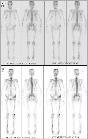 Figura 3. A) Cintigrama óseo preoperatorio. B) Cintigrama óseo un año postoperatorio.