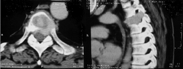 Por dolor intenso a nivel de columna dorsal se estudió con Tomografía Axial Computarizada y Resonancia Magnética (Figura 4), las que mostraron proceso infiltrativo a nivel de la vértebra T4, que desplaza la médula realizándose fijación de columna dorsal a este nivel. Biopsia compatible con tumor pardo (Figura 4).