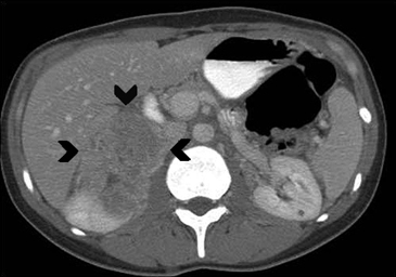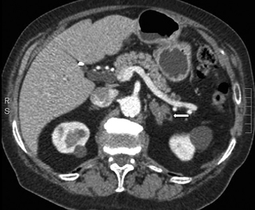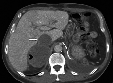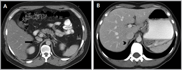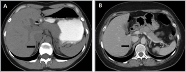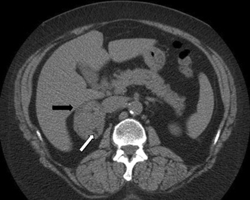 Figura 1. Glándula suprarrenal normal en tomografía computada. Cortes axiales de tomografía computada, donde se identifica la morfología normal de la glándula suprarrenal derecha (flecha) en fase no contrastada (a), y tras el uso de medio de contraste endovenoso (b).