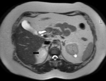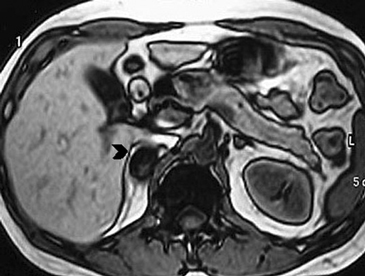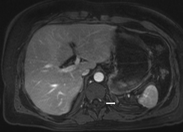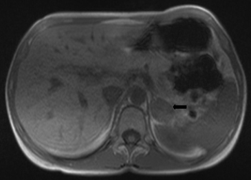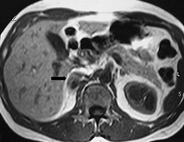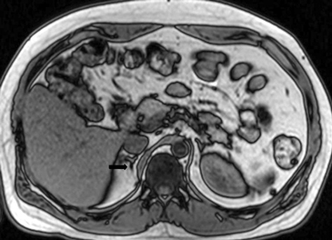Figura 13. Glándula suprarrenal derecha normal. Corte axial de RM ponderada en T1 "fuera de fase", donde se demuestra un halo hipointenso en el margen de la glándula suprarrenal, el característico artefacto en "tinta china". Se ha estimado que existiría una relación lineal inversa entre la caída de señal y el contenido lipídico intracitoplasmático. Sin embargo la intensidad de la caída de señal también depende de la relación grasa-líquido dentro del voxel, puesto que en un voxel que sólo contenga grasa (como en el caso de los mielolipomas que sólo tienen grasa macroscópica) no se demostraría caída de señal en secuencia fuera de fase pues no existen protones de agua que cancelen la señal. Sin embargo hay que señalar que existen adenomas pobres en lípidos y estos muestran un comportamiento similar al de una lesión partes blandas de manera que hay escasa caída de señal en secuencia fuera de fase, por lo que no es posible su diferenciación con esta técnica.