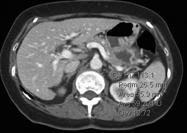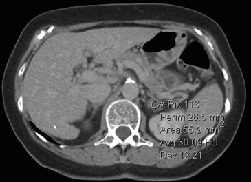 Figura 10. Adenoma suprarrenal derecho. Lesión suprarrenal derecha, cuya densidad es consistente con un adenoma típico. En la imagen se demuestra una adecuada medición de la densidad lesional, con una región de interés (ROI) que abarca al menos dos tercios de ésta.