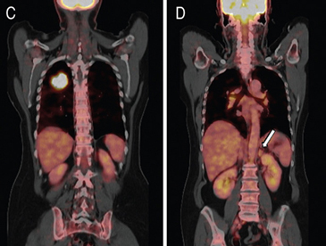 En el PET CT estas neoplasias característicamente no demuestran captación de FDG. Sin embargo se han reportado casos raros en que se obtuvo captación hetrerogénea dado el hipermetabolismo del componente hematopoyético.