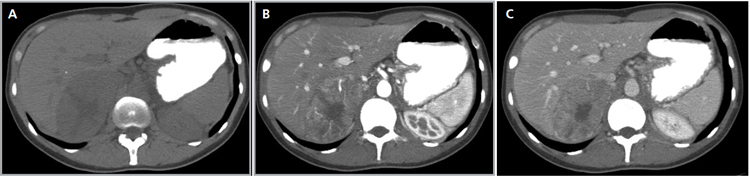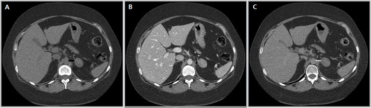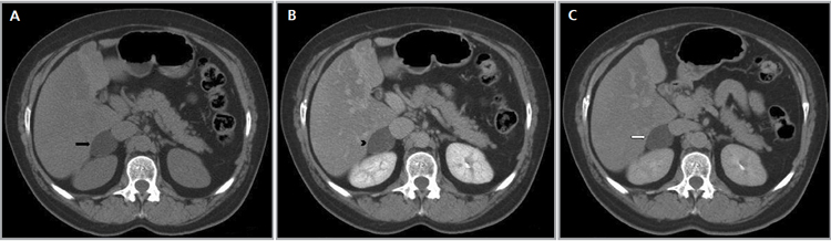 Figura 26. Feocromocitoma. Cortes axiales de tomografía computada en fase no contrastada (a) arterial (b) y tardía (c), donde se identifica una masa suprarrenal derecha que presenta significativo realce con el uso de medio de contraste.