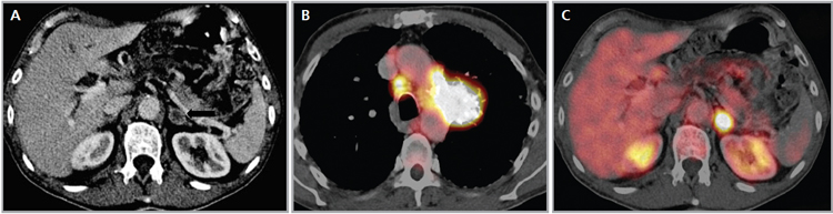 El PET-CT presenta utilidad en demostrar enfermedad oculta y enfermedad residual hipermetabólica cuando los hallazgos morfológicos son equívocos14. Esto cobra especial relevancia en casos en que la glándula suprarrenal es el único sitio de metástasis sospechado (Figura 21 a, b y c).