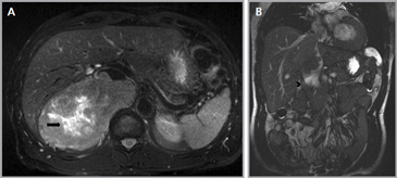 La apariencia en RM es inespecífica, presentando con mayor frecuencia hipointensidad con respecto al parénquima hepático en secuencias T1, hiperintensidad heterogénea en secuencias ponderadas en T2 y ausencia de caída de señal en secuencias fuera de fase, con escaso refuerzo progresivo tras el uso de Gadolinio endovenoso (Figuras 30 a y b).