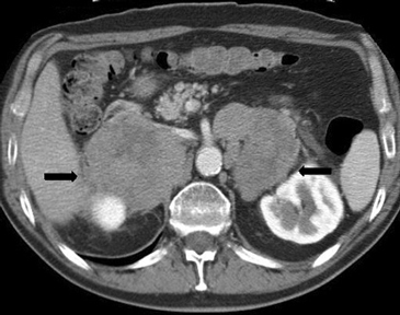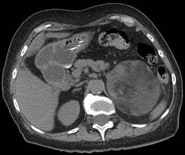 Los sitios más habituales de metástasis son hígado, pulmón, además de la invasión de las estructuras vasculares adyacentes, especialmente de la vena cava inferior, hallazgo que constituye una consideración fundamental al momento de planificar el abordaje quirúrgico (Figura 23 a y b).