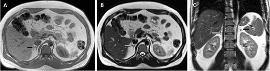 Figura 3. Glándula suprarrenal normal en resonancia magnética. (a) Cortes axial ponderado en T1 la señal de la glándula normal (flecha negra) es hipointensa respecto a la grasa retroperitoneal e isointensa respecto al parénquima hepático. (b) Cortes axial ponderado en T2 en que se muestra la glándula suprarrenal derecha (flecha blanca) y (c) corte coronal ponderado en T2 en que se muestra la glándula suprarrenal derecha (flecha blanca) y la glándula suprarrenal izquierda (flecha negra) con similares características de intendidad de señal. 3. Causas y prevalencia de las lesiones suprarrenales