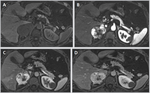 En RM se observan lesiones sin contenido graso, con baja intensidad de señal de las áreas sólidas en secuencias T2 y lavado rápido con el uso de contraste. Las áreas de necrosis presentan alta intensidad de señal en imagines ponderadas en T2.