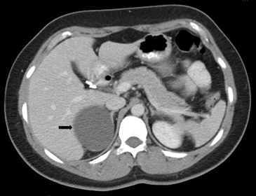 En TC se manifiestan como una lesión hipodensa, con valores de atenuación menores a 20 UH, de paredes finas, y en un 15% presentan calcificaciones parietales punteadas o curvilíneas. No demuestran refuerzo intralesional, sin embargo puede identificarse fino refuerzo anular determinado por segmentos de la glándula suprarrenal normal que se encuentran adyacentes a la lesión.