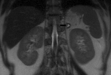 La secuencia gradiente fuera de fase se reconoce porque existe pérdida de señal en la periferia de los órganos en donde contactan con el tejido adiposo, produciéndose un halo negro que rodea a los órganos como si estuvieran dibujados con "tinta china", lo que es evidente en las glándulas suprarrenales, debido a que están inmersas en tejido adiposo y es esa interfase entre la glándula y el tejido adiposo que la rodea que produce este artefacto de cancelación (Figura 13).