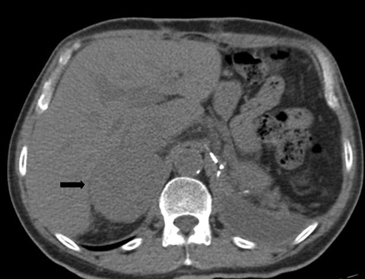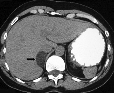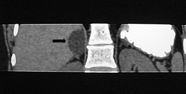 Figura 6. Lesión homogénea, de contornos bien delimitados (flecha) visualizada en tomografía computada sin contraste realizada en contexto de estudio de diseminación de cáncer mamario. A pesar de los caracteres morfológicos aparentemente benignos, se demostró que la lesión correspondía a una localización secundaria.