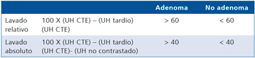 Luego de la administración de contraste endovenoso los adenomas aumentan su densidad debido a que son vascularizados, lo que se puede objetivar midiendo directamente el valor de atenuación en UH, pero tiene una particularidad en que, el lavado de contraste es más rápido que el de las lesiones no adenomas incluidas las malignas. Las lesiones malignas tienen una red capilar de mayor densidad, con flujo más lento, y los capilares de neoformación son más porosos, por lo que el medio de contraste difunde con facilidad al espacio extravascular. Así, el medio contraste tiende a acumularse en el tejido y a lavarse lentamente, a diferencia de lesiones benignas en que el lavado contraste es rápido porque al estar la red capilar intacta el medio de contraste se queda intravascular. Dado que el valor de atenuación absoluto depende de la dosis de contraste, flujo y gasto cardiaco entre otros factores, se ha considerado de mayor utilidad realizar una comparación relativa porcentual, comparando la densidad de la lesión en la fase contrastada con la densidad de la lesión en fase tardía y así estimar el lavado de la lesión. Muchos exámenes de TAC abdominal en que no se sospecha una lesión suprarrenal, se realizan con medio de contaste ev sin contar con una fase no contrastada, por lo que no se dispone del valor de atenuación original de la lesión. En estos casos si se detecta una lesión suprarrenal incidental, se obtiene una fase tardía a los 15 minutos después de la administración del contraste ev para poder estimar el porcentaje de lavado en la lesión. Si se dispone del valor de atenuación en fase no contrastada se puede calcular el porcentaje de lavado absoluto y si solo se dispone de fase contrastada se calcula el porcentaje de lavado relativo (Tabla 1).