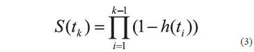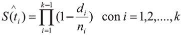 Pues la probabilidad de sobrevivir a un determinado intervalo de tiempo es una probabilidad condicionada a haber llegado vivo a dicho intervalo. Así al reemplazar h por su estimador (ecuación 2) en la ecuación 3 se obtiene el estimador de la función de sobrevida de Kaplan-Meier (también denominada estimador producto límite):
