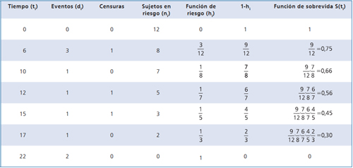 Se sigue en el tiempo a 12 individuos con una prótesis cardiaca y se encuentran los siguientes tiempos de sobrevida en años: 6+, 6, 6, 6, 10, 12+, 12, 15, 15+, 17, 22, 22, donde el signo más indica censura; es decir se perdieron 3 individuos en los tiempos 6, 12 y 15. La manera más cómoda de calcular los estimadores anteriores es disponer los datos en una tabla como la siguiente: