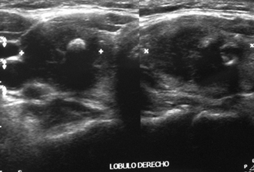 Paciente de sexo femenino, 61 años, con antecedentes de hipertensión arterial y dislipidemia. Estando asintomática, en control médico se pesquisa TSH disminuida por lo que fue derivada a endocrinología. Al examen físico destacaba a la palpación tiroidea un nódulo derecho, duro, móvil, no doloroso. El perfil hormonal confirma un hipertiroidismo subclínico (TSH 0,07 μUI/mL y T4L 1,33 ng/dL). Se solicita ecotomografía tiroidea que demuestra un bocio multinodular destacando un nódulo dominante en el lóbulo derecho, hipoecogénico, mal delimitado, asociado a gruesas calcificaciones, de 17,9 x 27,1 mm, con flujo al doppler color (Figura 1 y 2). Se realizó un cintigrama tiroideo que evidenció un nódulo hipercaptante en el lóbulo derecho con supresión parcial del resto del parénquima glandular; probablemente responsable del hipertiroidismo subclínico. Se solicita PAF del nódulo dominante cuyo resultado fue compatible con un carcinoma papilar tiroideo. La paciente se somete a tiroidectomía total, la cual se realizó sin incidentes. El resultado de la biopsia fue un carcinoma papilar, unifocal, variedad oncocítica tipo Warthin de 2,2 x 1,7 cm; el tumor no se extendía a tejidos peritiroideos, ni alcanzaba los bordes quirúrgicos, pero sí se observaban permeaciones vasculares tumorales (Figura 3). Recibió 100 mCi de yodo radioactivo (con TSH 90,12 μUI/mL, T4L 0,21 ng/dL, Tiroglobulina 2,8 ng/mL y anticuerpos antitiroglonbulina 1 UI/mL). La exploración sistémica evidenció una moderada a intensa captación en región anterior del cuello en relación al lecho tiroideo; el resto del cuerpo se apreciaba de distribución normal y no se evidenciaban imágenes sugerentes de metástasis extracervicales. La paciente inicia tratamiento con levotiroxina. En el control de los 6 meses la paciente se encontraba en buenas condiciones generales y asintomática, la ecografía cervical no mostraba evidencia de recidiva local, la tiroglobulina estaba indetectable (< 0,5 ng/mL) y los anticuerpos antitiroglobulina se mantenían negativos (1 UI/mL).