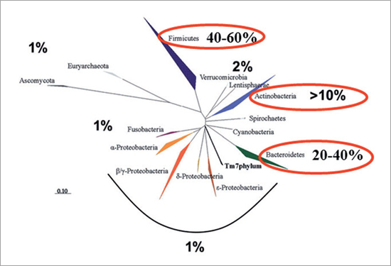 Comparado con ratones normopeso, la MI de ratones obesos ob/ob muestra concentraciones de Firmicutes aumentadas en más de un 50% mientras que las de Bacteroidetes disminuyen correlativamente23. A pesar de que las concentraciones colónicas de AGVs sean mayores en los ratones obesos, la cantidad de energía excretada en sus deposiciones es menor, indicando que el proceso de extracción y absorción de energía a partir de los alimentos es más eficiente en el animal obeso que en el normopeso23. Tal situación podría deberse a que el número de genes bacterianos dedicados a la hidrólisis de polisacáridos es mayor en la MI de los animales obesos que en la de los normopeso. Cabe destacar que los ratones axénicos normopeso convencionalizados con MI de ratones obesos almacenan más grasa corporal y ganan más peso que aquellos convencionalizados con MI de ratones normopeso23. Estas observaciones indican que la mayor capacidad de extracción de energía y de almacenamiento de grasa es una característica transmisible en la cual participa la microbiota. La MI del ser humano obeso se comporta en forma similar a la del ratón obeso: el porcentaje de Firmicutes es mayor y el de Bacteroidetes menor, en comparación con los normopeso24. El seguimiento de la MI de voluntarios obesos quienes recibieron una dieta hipocalórica durante un año muestra que a medida que los sujetos pierden peso, la proporción de Firmicutes disminuye mientras que aumenta la de Bacteroidetes24. En sujetos normopeso alimentados con una dieta normo- o hipercalórica, se ha observado que un aumento del 20% de los Firmicutes y una disminución del mismo orden de los Bacteroidetes se asocia con un incremento diario del salvataje de energía equivalente a 150 kcal25. Estimulados por estas observaciones, numerosos estudios realizados en los últimos años han tratado de dilucidar la compleja interrelación entre MI y obesidad en el ser humano. Si bien estos estudios han confirmado la existencia de disbiosis (alteración de la MI) en los obesos, aún no existe un consenso acerca de las poblaciones bacterianas responsables del desarrollo de la obesidad1-3. En termino general la MI de los sujetos obesos presenta una menor biodiversidad que la de los sujetos normopeso. Aquellos individuos con menor biodiversidad tienden a presentar mayor adiposidad, resistencia insulínica, dislipidemia y un fenotipo inflamatorio más pronunciado comparado con aquellos con alta biodiversidad26. Algunos autores han propuesto que la presencia en la MI de concentraciones altas de Staphylococcus aureus y bajas de Bifidobacterium spp. en la infancia podría predecir la futura aparición de sobrepeso u obesidad27.