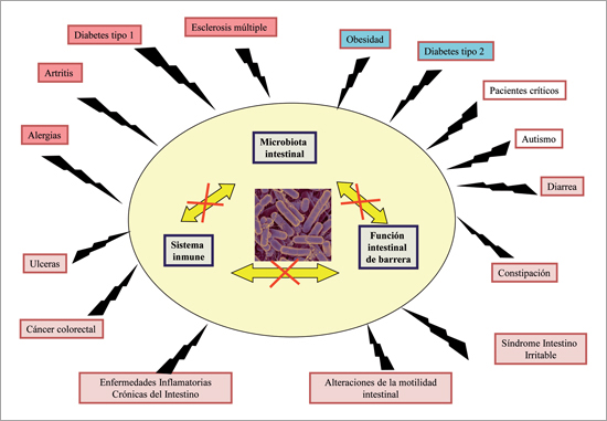 La distribución de la MI a lo largo del tubo digestivo no es homogénea sino que sigue una gradiente próximo-distal; las concentraciones de microrganismos, bajas en el duodeno, aumentan paulatinamente en el yeyuno y el íleo hasta alcanzar sus máximos en el colon (Figura 2). Paralelamente, existe también una gradiente de permeabilidad epitelial (un componente esencial de la función intestinal de barrera): el epitelio duodenal es muy permeable lo que contribuye al intercambio rápido de agua y electrolitos entre lumen y compartimento sistémico que ocurre durante el periodo post-prandial para restablecer la iso-osmolaridad del contenido luminal al plasma6. Sin embargo, esta permeabilidad epitelial disminuye progresivamente en el yeyuno e íleo (lo que significa que se incrementa la función intestinal de barrera) y llega a su mínimo en el colón, lo que le permite al epitelio colónico hacer frente a la alta densidad de microrganismos presentes a este nivel (Figura 2). Finalmente, existe también en el tubo digestivo una gradiente de inmunidad: la densidad y tamaño de los folículos linfoides y de las placas de Peyer, que agregan gran parte de las células inmunes presentes en la mucosa, aumentan desde el intestino proximal hasta el colon (Figura 2)6. La homeostasia del ecosistema digestivo está determinada por el equilibrio harmonioso entre estos tres componentes: microbiota, permeabilidad intestinal e inmunidad local. Cualquier factor o evento que afecte uno de estos componentes repercute sobre los demás e impacta negativamente sobre el organismo entero. Un gran número de enfermedades del sistema digestivo (diarrea, EICI, síndrome de intestino irritable), del sistema inmune (alergia, diabetes de tipo 1, esclerosis múltiple), del sistema nervioso central (autismo, esquizofrenia) o metabólicas (obesidad y DM2) están asociadas con alteraciones de la MI, de la función intestinal de barrera y de inmunidad local digestiva, aun si no se sabe con certeza si dichos cambios son causas o consecuencias de estas patologías (Figura 3). El concepto de prebiótico y probiótico ha sido desarrollado en el marco de la MI; ambos compuestos pueden ser considerados como herramientas nutricionales de interés para restablecer el equilibrio de la MI en los individuos cuya enfermedad está asociada con alteraciones de esta7.