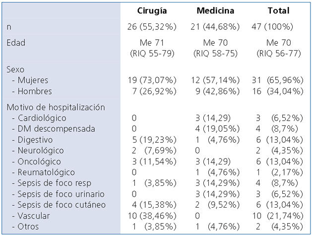 La poblacion estudiada estuvo compuesta por 47 pacientes, los datos demograficos se resumen en la Tabla 1. El 65,96% (n = 31) fueron mujeres, con una mediana de edad de 70 anos (RIQ 56-77), y el 55,32% (n = 26) estuvieron hospitalizados en el Servicio de Cirugia. El 95,74% (n = 45) de los pacientes eran DM tipo 2, y el 82,98% (n = 39) presento como comorbilidad mas frecuente la hipertension arterial, seguido por la enfermedad renal cronica (25,53%, n = 12). La mediana de los anos de DM fue de 10, similar en ambos servicios.