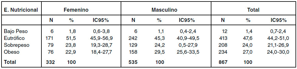 La prevalencia de obesidad, es significativamente mayor en varones (p< 0,01), asimismo la prevalencia de sobrepeso fue mayor en varones en comparación con las niñas, sin embargo, esta diferencia no alcanza significación estadística (Tabla 2).