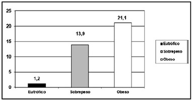La prevalencia de telarquia precoz en mujeres se correlaciona en forma importante con el estado nutritivo, siendo 0,56%, 12,66% y 21,05% en niñas eutróficas, sobrepeso y obesas respectivamente (p< 0,0001) (Gráfico 1).