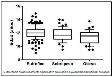 Se obtuvo respuesta de la encuesta de menarquía en 1.233 de 1.430 niñas. De ellas, 265 niñas habían presentado su menarquia con un promedio de edad de 11,87 ± 0,97 años. Al compararlo según estado nutricional esta fue de 12,01 ± 0,94 años; 11,80 ± 0,98 años y de 11,40 ± 0,96 años en niñas eutróficas, con sobrepeso y obesas respectivamente, presentando las niñas obesas una diferencia estadísticamente significativa respecto a las niñas eutróficas (p< 0,05) (Gráfico 2).